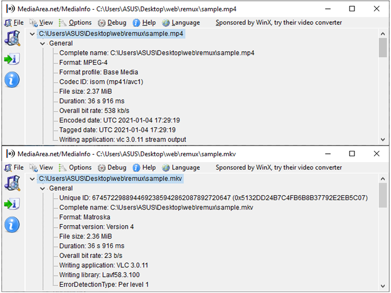 To take a look into more details, we can use “MediaInfo”, an open source cross platform tool that displays technical information about media files. Following are the snippets of the general information for the same two files: