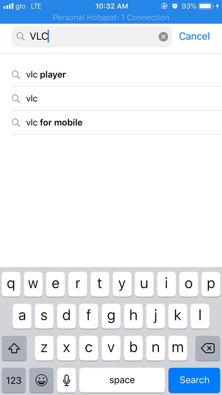 Type in vlc on the Search bar, then tap the blue Search button in the lower-right side of your keyboard.