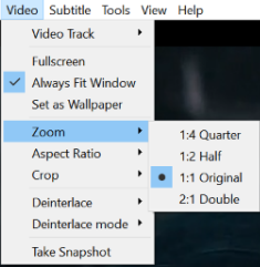 You can enlarge videos in different sizes. This option is useful if you want to change the size of a video track which is being played. The supported sizes are 1:4 Quarter, 1:2 Half, 1:1 Original (default) and 2:1 Double. To view a video in a particular dimension, select a dimension in Video ‣ Zoom.