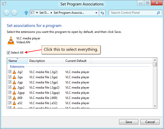 If you want to set VLC the default media player for all kind of files, check the Select All box.